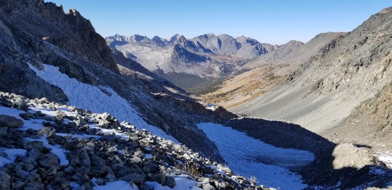 We crossed two more snow fields, and many more fields of large talus, as well as one very very intense, steep scree slope that somehow, I don’t know how, I made it across. There were times when I just felt stuck, like there was nowhere for me to go. Not only that, I could not even turn around safely and go back. These moments downright suck and I feel so anagry at the SHR for being this way. Is this really necessary??