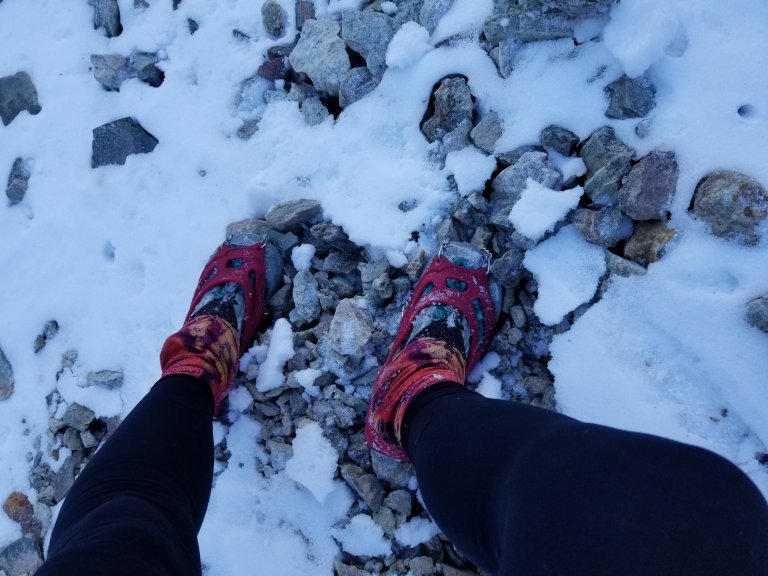 I witnessed Hurlgoat take a steep slide down one of scree slopes and it sent a jolt of adrenaline through my veins. He even admitted it was pretty sketchy, so I went up and around another way. This proved initially to be a better decision, but then I got myself into a pretty steep and sticky situation, trying to make my way down a steep scree and talus slope covered in snow, using my trekking poles to stop the momentum.