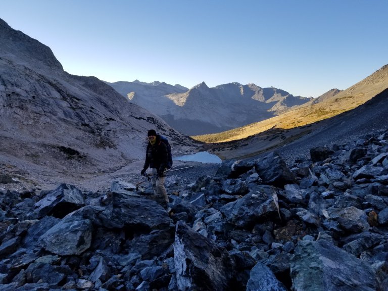 As I had mentioned yesterday, today was purportedly going to be quite the challenging day, especially climbing up Sky Pilot Col, and even more especially climbing DOWN Sky Pilot Col. I’m not going to lie, I had some fear in me about all this. Of course, all I can do is embrace it, and “see what happens”. Knowing that today was going to be a challenge, and it was going to be difficult, scary at times and very slow going through lots and lots of steep talus and scree, I also had no choice but to set my mind for it. I decided last night before going to bed that today would go really well, that I would rise to the occasion.