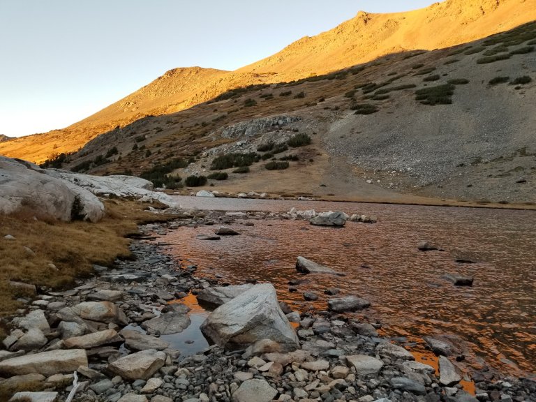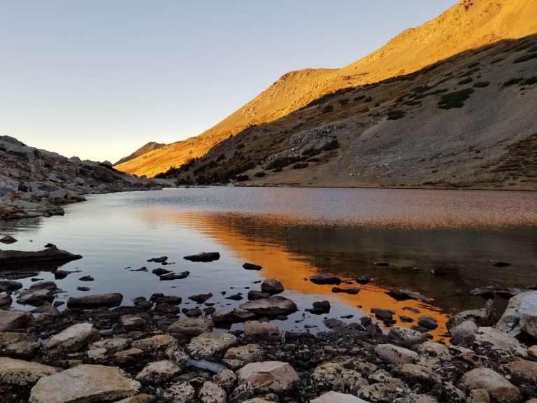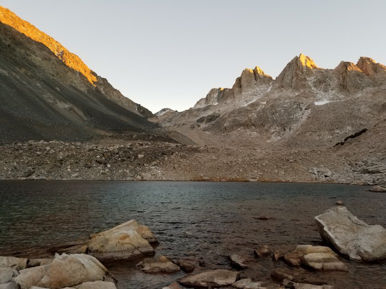 We reached Shepherd lake and got to bask in the glory of alpenglow for a few minutes as we skirted the Western shore of the lake. The immense dark wall of rock that lines it’s East shore is impressive to say the least, and as it rises up a thousand feet or more in a straight scree slope, the tops of the ridge were glowing orange from the setting sun. To the South we were looking at granitic craggy peaks reminiscent of Whitney and the sliver of the moon was floating just next to them.
