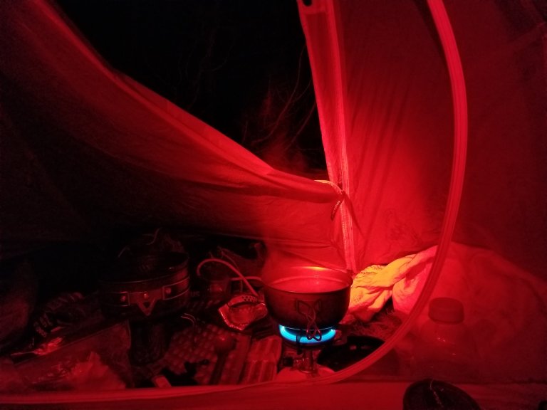 I get into my sleeping bag immediately and put on dry socks, as I cannot feel my toes. I curl up in a ball and try to get warm, while Hurlgoat boils me some water for tea. I place the hot cup inside my sleeping bag, between my legs, between my feet, on top of my toes, everywhere, and it is amazing. Since we are sharing a stove, he begins to cook his dinner while I sip my tea and massage my feet. After a while, I start to feel the toes come back to life. We listen to some mellow folk music and snuggle together while dinner is cooking and outside the wind is absolutely HOWLING. We got a good spot, even with all that wind, we are protected. It’s been a long ass day, nearly 12 hours and we only made 9 miles. We climbed 3,000 ft and descended 2,700 feet in that 9 miles. It doesn’t seem like much but what a difference terrain makes!