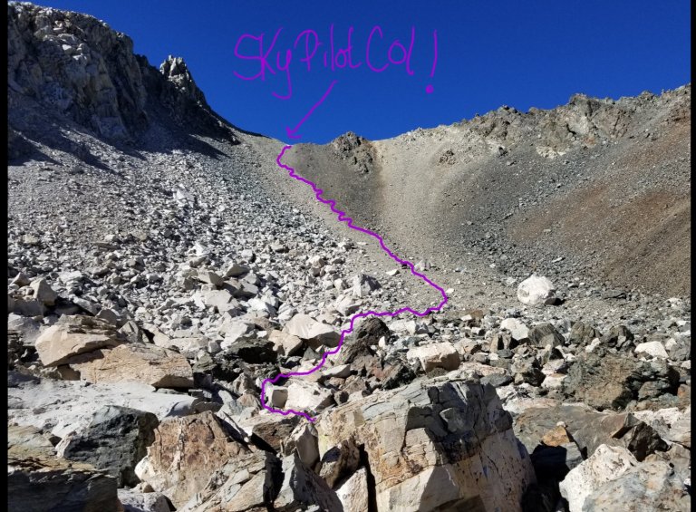 Once refreshed, we were gearing up now for the toughest part of the day. Sky Pilot Col. From where we were, it was a mere .5 miles to the Col (as the Bird Crows, as Hurlgoat says) and 700 feet of elevations gain. The trick was, however, that it was all scree and talus the entire way. We were feeling good though and we planned on it taking us around 2 hours to reach the top. We also planned on it taking us about 3 hours to descend the 1,300 feet on the North side, down to Shepherd Lake. Well, let’s see what happens. We hoped we could make it to a good campsite before dark.