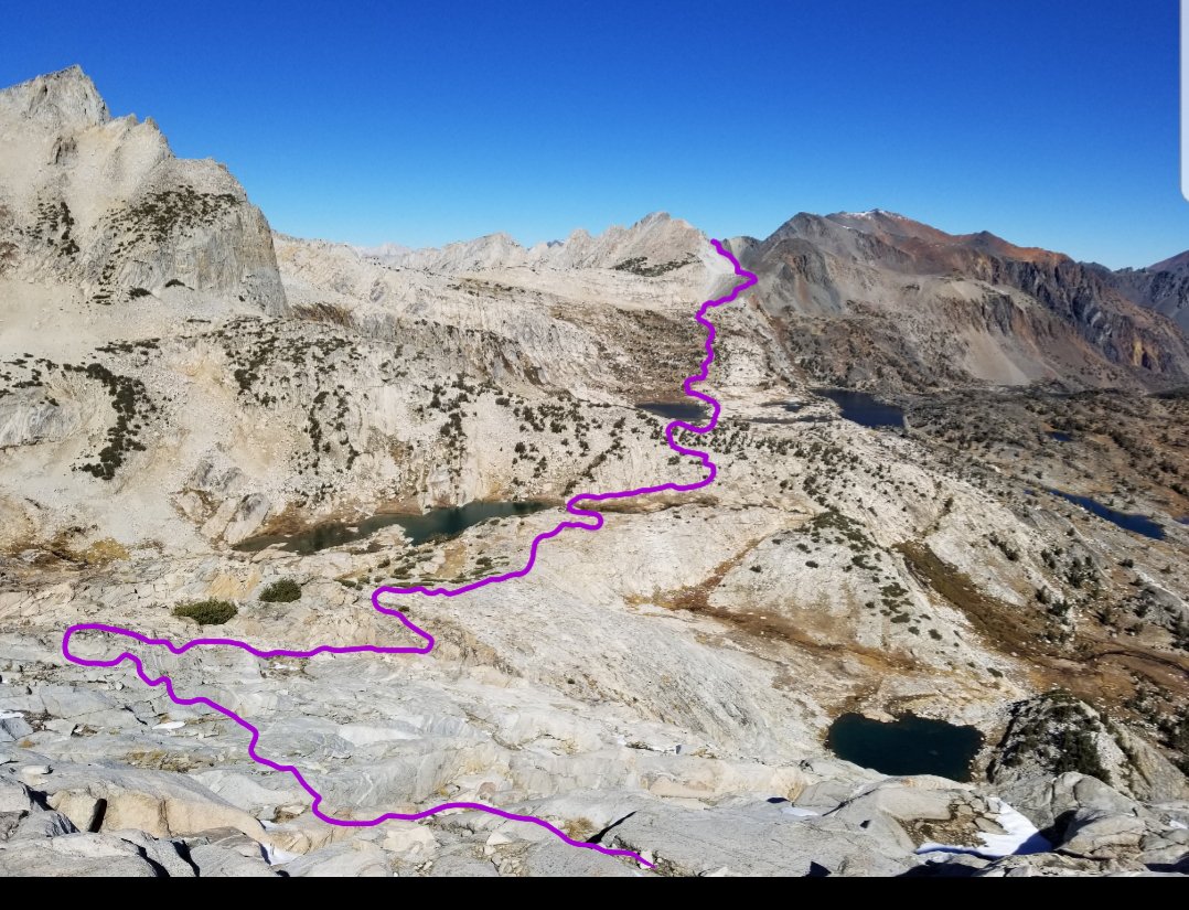 We agreed this ridge was definitely pass material, even though Roper does not call it a pass. It involved several hundred feet of very steep climbing, several shelves that seemed like false summits, and then at what we thought was the “top” we had to turn and start climbing further up big slabs of granite, and scramble up even higher, then traverse across a contour line with big boulders and slabs, before finally descending.