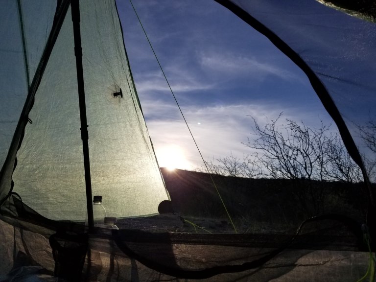 I walk for what seems like a painful eternity up on that ridge and then it finally begins a big descent. I know at the bottom is where I will camp. I pleaded with the Universe and my unseen help to get me to camp by 8:30 pm and in the comfort of my tent by 9pm. I asked specifically for a tentsite that was safe and protected from the wind, that was flat and easy to get my stakes into, that didn’t have a bunch of cow shit everywhre, nor rocks. And well, that is exactly what I found, in the pitch dark at 8:34pm. And so it is. By 9pm I was in my tent, all tucked in and eating my dinner heartily. Day four comes to a close. I’m ready to rest.
