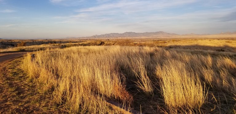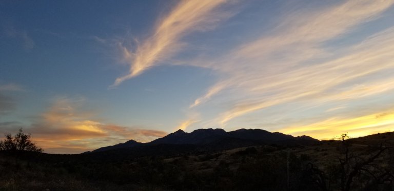 I pushed on into a stunning sunset. What I am learning here in Arizona is that the sunsets are 360 degrees. No matter where the sun actually goes down, there are beautiful clouds that take on different shapes and colors in every direction. Tonight was especially amazing because I was out in an open field with hardly anything to obstruct the views. It was memorable and magical walking in fields of golden light cast against a deepening blue sky that framed multi colored clouds like a piece in a puzzle. Taking it all in….I walked, almost floating, as if under a spell.