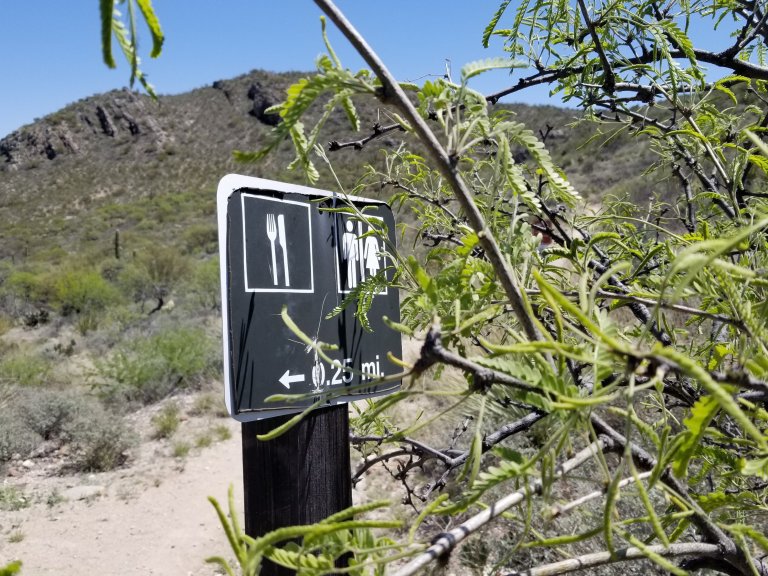 Flyby then also told me there was a place called Colossal Cave a mile or so off the trail up ahead, and rumor had it they had a snack bar and gift shop. Snacks! Yes, going to a snack bar sounded absolutely perfect and we made a plan for the side trip together. We first followed a sign at a trail junction that depicted a fork and knife. Fork and knife, we figured, meant snacks. So we followed that trail for a quarter mile, but it only took us to a picnic area. No snack bar. Disappointed, we had to backtrack and re-evaluate. So much for the fork and knife symbol, we got snookered, as my Dad likes to say!