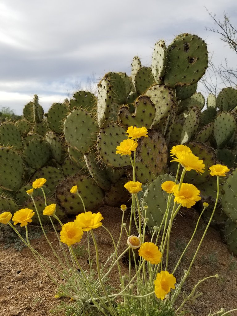 As I walked along, I absorbed the bright striking flowers of all the other cacti and little plants. Everything is looking so vibrant and healty after the winter rains. There are blooms absolutely everywhere and the sky was a foreboding gray with dense clouds building up.