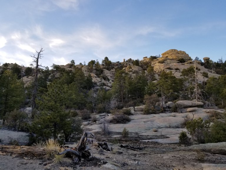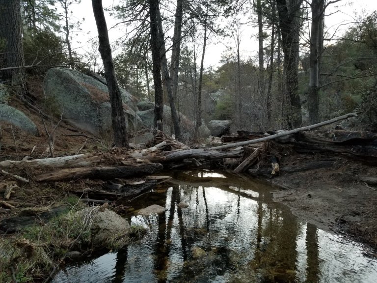 The temperature was dropping and I slipped on a light jacket. Feeling cooler, fatigued and losing daylight, I started to give up and look for possible campsites. It was a silly war inside my head, as I had no obligation to be anywhere tonight, but I wanted that campsite in the pines! It was only another 1.5 miles, how long could that take? I pushed on but seemed to be moving super slow, The terrain was rather tedius and I wasn’t finding a rhythm, so it took way longer than it needed to. It was sort of a test of my patience, but the scenery was enough to distract me with its beauty. I crossed several more creek beds that had a little water, mostly pools, some had fresh running water. I even walked through a small gorge that was apparently a habitat for frogs that sound exactly like sheep?! It took me a while to figure that one out!