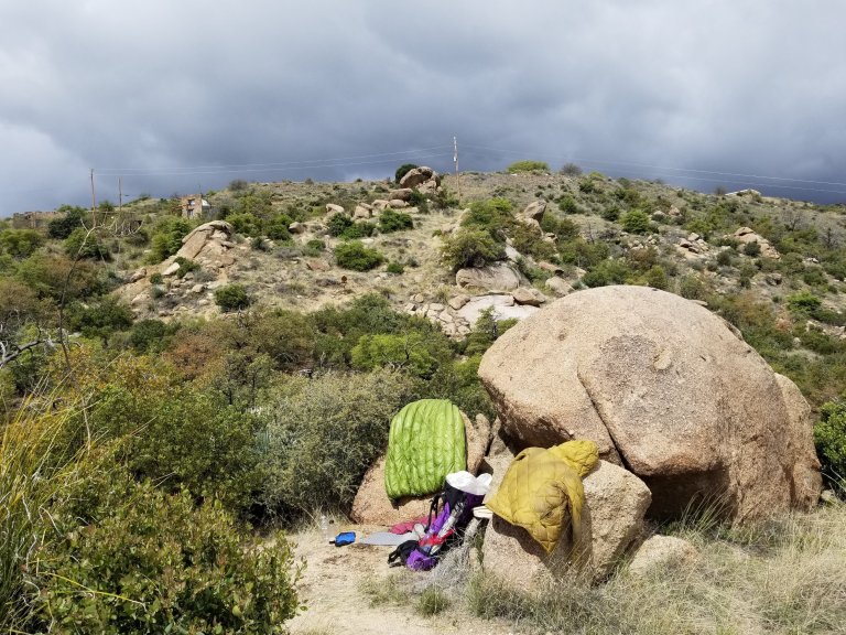 My original goal for today was 25 miles and I stopped at 24 satisfied. I have a great campsite in a wash where I am protected from the wind and the evening air is nice and still. There’s no dout going to be condensation tonight, but I happen to know it’s also going to be 80 F and sunny tomorrow, so no worries getting stuff dried out again. Dinner was rehydrated quinoa with Brussels sprouts and tempeh topped with coconut oil. For desert: Mississippi mud cake, total bomb from my Mom!!