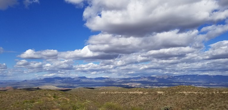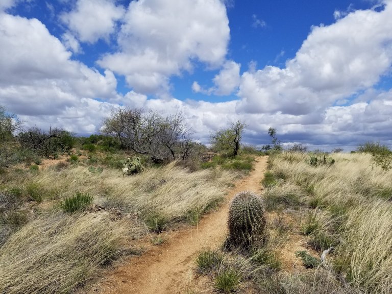 The sun was now out and hike I did. The trail turned into an absolute dream all this afternoon and evening. The day kept getting more and more beautiful with all the rich popping colors of the desert after a cleansing rain. Depth and texture became enhanced by the billowing clouds and their moving shadows. The diversity of this section of trail is amazing. There were myriads of birds singing to me all afternoon and the lovely whooshing sound of the cool breeze on cactus needles. It’s different than the whoosh of wind on pine needles, it has it’s own tone and I am loving this new sound!
