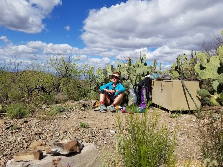 I cranked out the next 8.6 miles in less than 3 hours and made it to the Tiger Mine Trail head by 3:00pm. I had collected some water from another cache just a couple miles prior, and here there was yet another cache. Thank you AZT Trail Angels! Enter the land of water caches in the AZT. This one had at least 30 gallons in it, stashed inside a bear box by the trail, it was amazing and plentiful. I wasn’t sure how much to carry and needed to consult my Guthook app, so I dropped my pack and took a seat. It was time to eat too, and on the menu were tortillas with cheese, avocado and BBQ potato chips, oh my how this hit the spot!