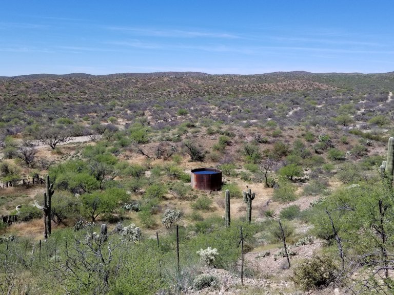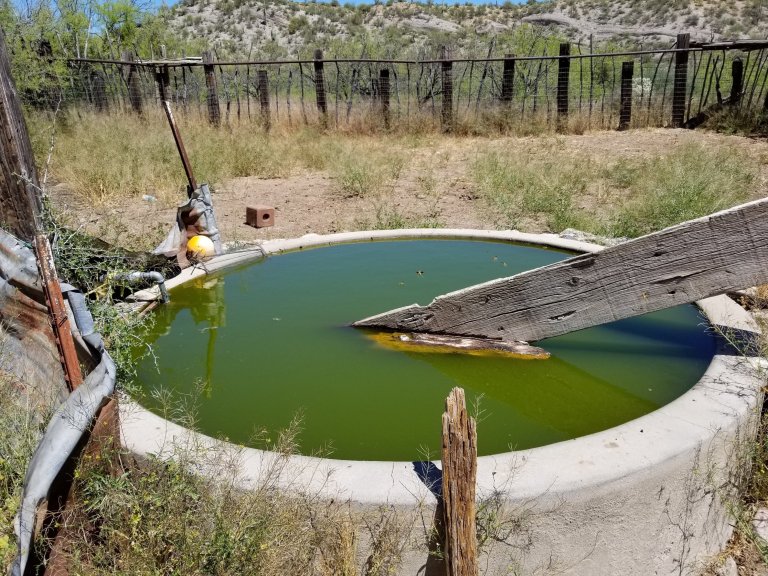 I tried to bushwhack along the fence line to get down to the tank, and of course I fell down on the rocks. Flustered and shaky with adrenaline, I stood back up, wondering what exactly I was trying to do here. I saw the tank from up above and realized I’d still have to cross the barbed wire fence to get to it. This doesn’t make any sense.