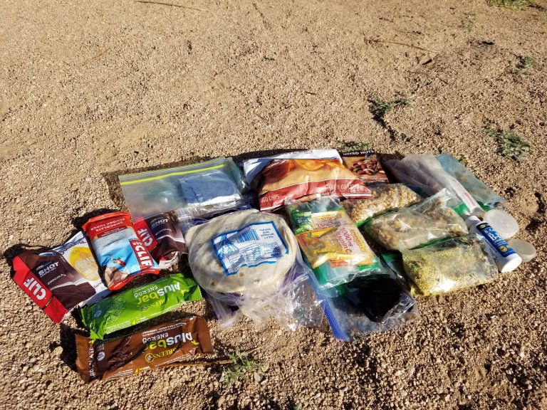 When I reached the Freeman Road trail head at 4:45 pm I was stoked to realize I had completed 20 miles. There was hope of making 30 today afterall! I topped off on some water from the cache there and layed my sleeping bag out to dry, because I’d forgotten to earlier. I needed to kill about 15 minutes to do this, so I dumped out my food supply and very neatly organized it. Yep, absolutely nothing “extra”. It was exactly enough to make it until Saturday afternoon.