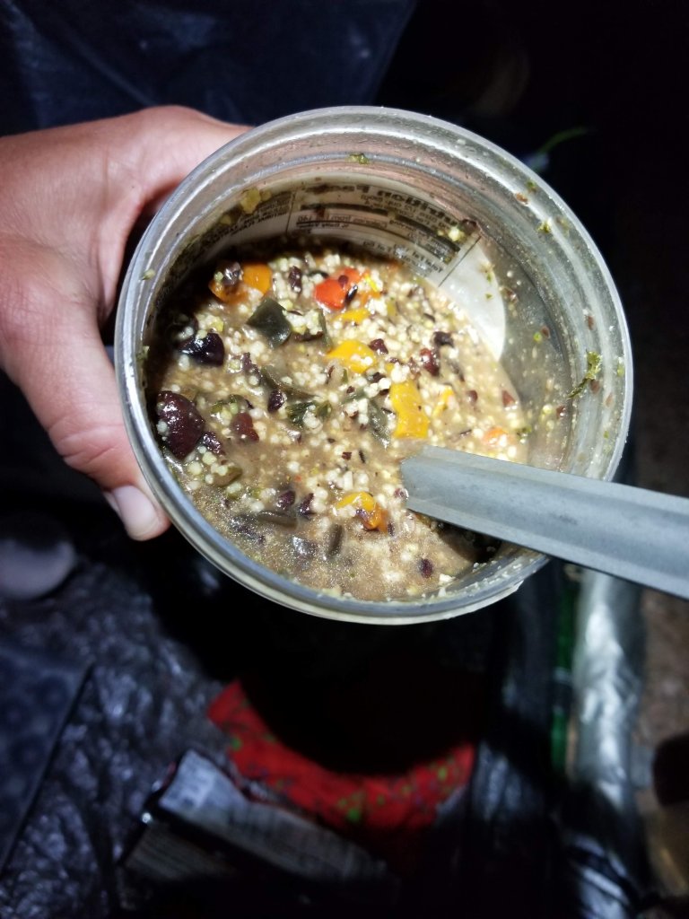 Cold soaked curry couscous with refried beans with some dehydrated eggplant and peppers and coconut oil was on the menu for dinner, and it was super tasty! Then, the best part, yes, Mississippi mud pie for dessert. I am still rationing it, don’t ask me how I’ve got the will power, but I am saving a few bites for tomorrow. It is so damn good at the end of a long ass day. Perhaps the best thing ever. Well, let’s see if I can do this all again tomorrow. Knowing I have mud pie to look forward to is motivation enough. But what I really want is Ice Cream. Where’s the ice cream?!