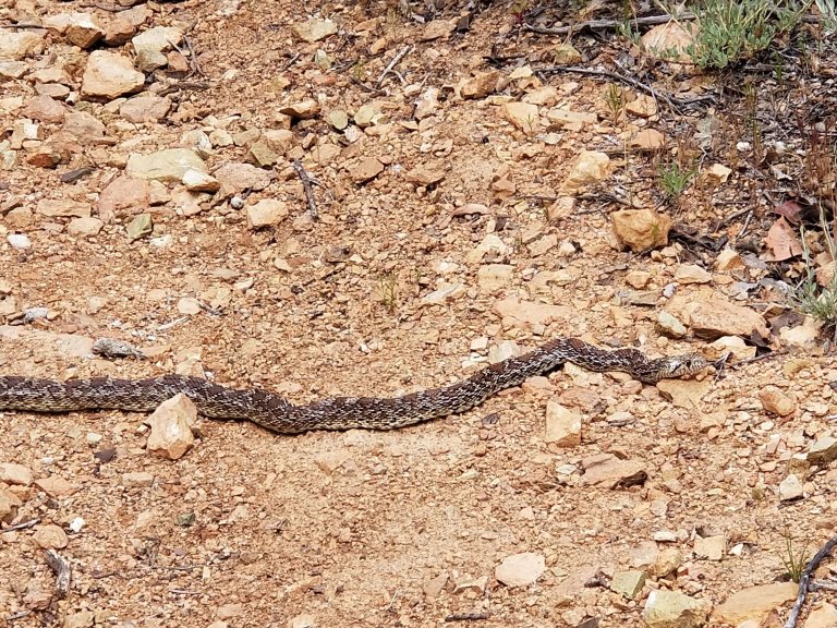 I determined it was not a rattlesnake, no diamond shaped head, no rattle on it’s tail, scales were glossy not matte. I waited patiently, then tried to coax it along by tossing tiny little pebbles at it, but it was so stone faced, it did not even flinch. Is it even alive?