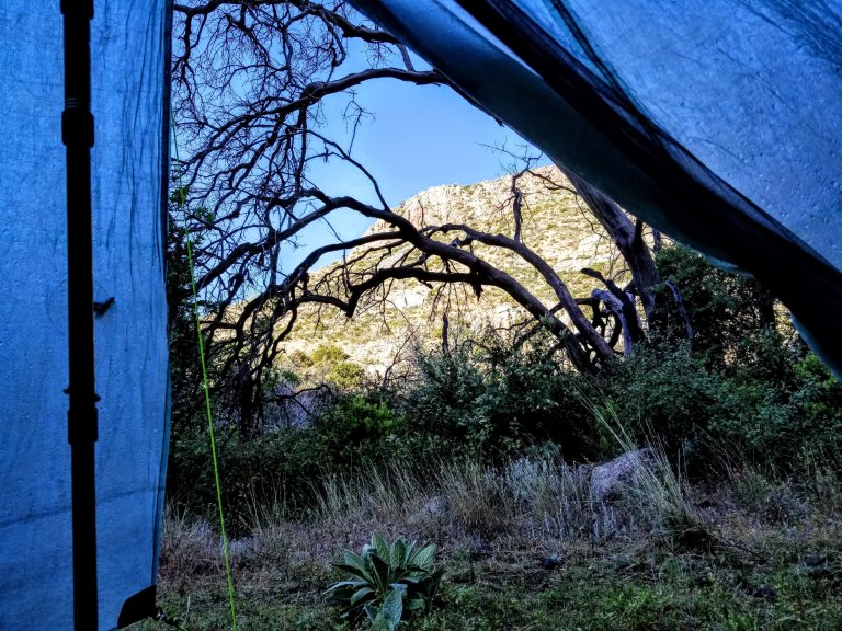 I reached the Y Bar trail junction right at dusk, just in time to pitch my tent with some light still remaining. There is one perfect flat place to pitch, and lucky for me, it is mostly out of the wind. I like this campsite a lot. Its a small saddle, and it is exposed, but yet tucked in by a big old dead Juniper tree, it’s a great little perch. I am in awe of the stoic Mazatzal Peak that governs the land here and I read about it’s history in my Guthook notes. I feel really excited to be here, I love this campsite, and this gigantic piece of rock I’m looking at, it all feels simply amazing.