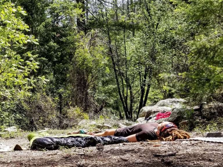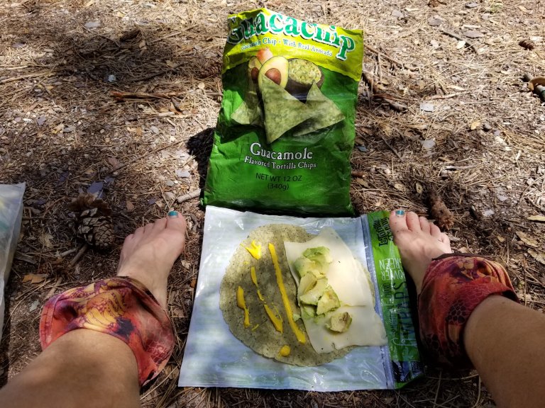 In the dark shadows of the peak, I sit outside eating my dinner: garlic couscous and a tortilla with avocado (both from the trail magic yesterday, thank you very much!) Followed by mouthful after mouthful of Guacachips and several handfulls of Peanut M & M’s. A fine hiker trash feeding frenzy. I really had to stop myself, I felt like I could just keep eating and eating. And now, as I lay in my bag, curled up and writing, my body is chilled, I do feel tired, and ready to tuck into my sleeping bag, get warm and get some rest under the shadow of this beautiful, giant rock.