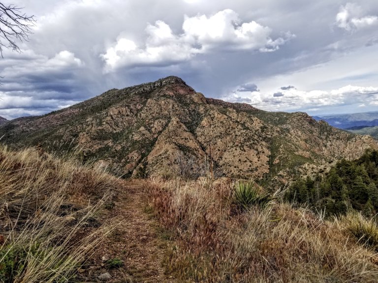 The trail meets a ridge with wonderful flat walking on matted red clay tread. My internal compass has me headed straight toward Mazatzal Peak, though I don’t know it yet that this exact prominent rock is Mazatzal Peak.