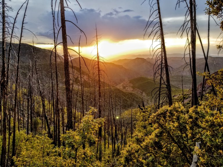 Rewarded with a glowing sunset situated behind some thickening gray clouds along the horizon, I realize how blessed I am that this part of the trail happens to be a ridge walk along a Western facing slope. This time of day, is so magical. The last rays of sunlight casting beams across all the mountains between here and as far as the horizon will allow itself to be seen.