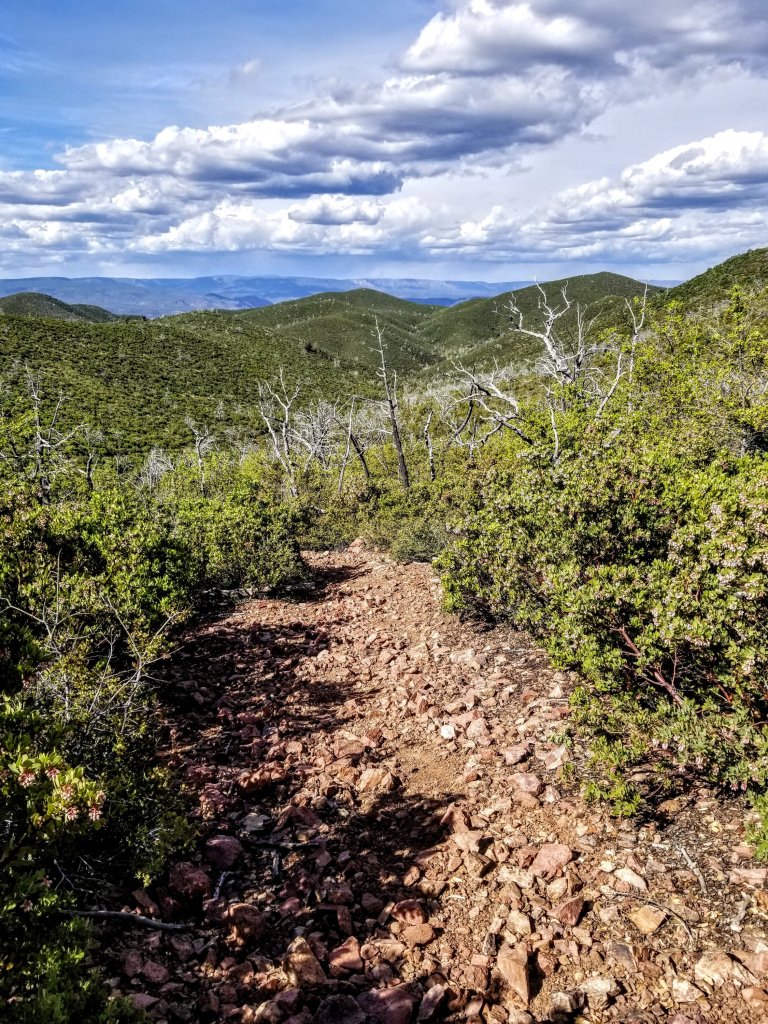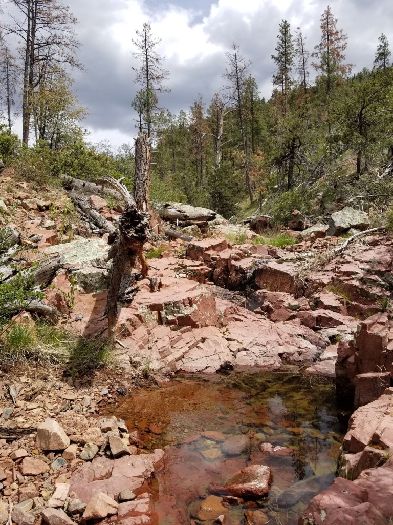 I push up the steep slope for maybe 10 minutes, then it levels off much sooner than expected. A wave of relief washes over me as I become aware I have popped up onto yet another Mesa. This one now made of limestone and volcanic rock, and there are many many trees, a soothing scene of Juniper and Pine.