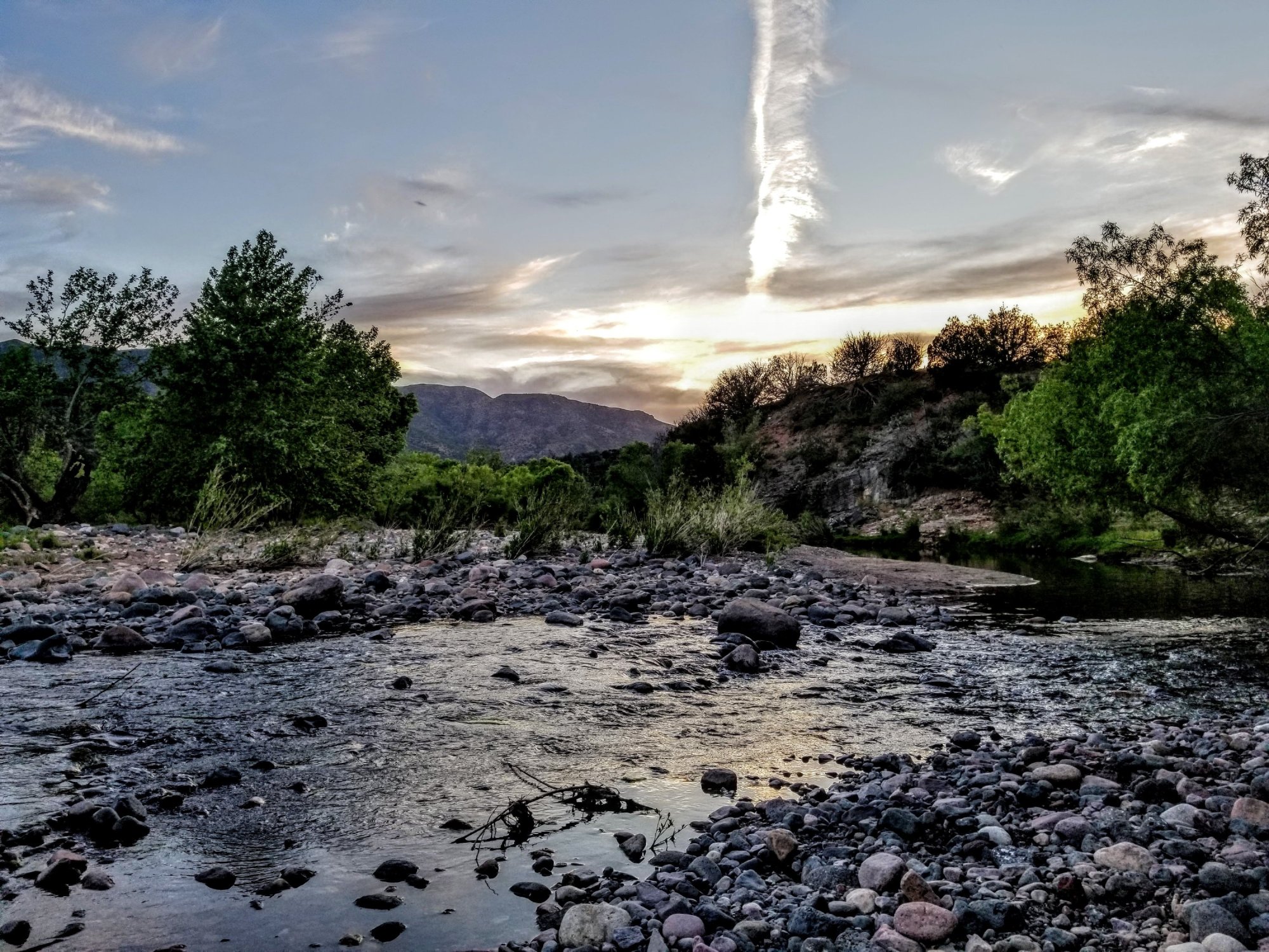 7:14pm: The sounds shift to night sounds, crickets, cicadas, a breeze, and the river continues to gush over rocks.