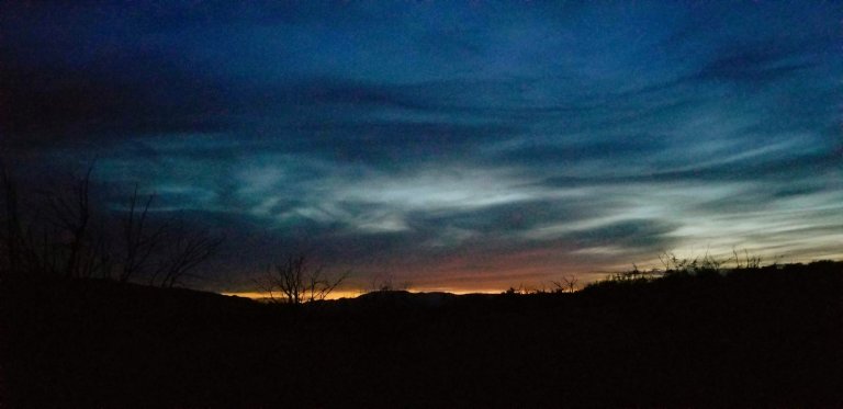 Sounds of crickets, sky glowing cobalt blue, lightening flickering to the east.
