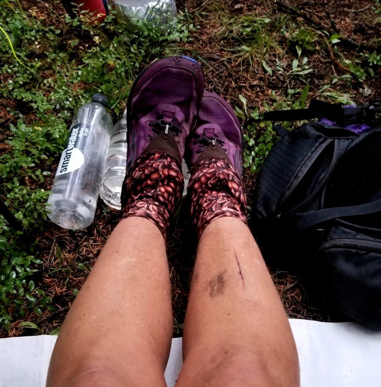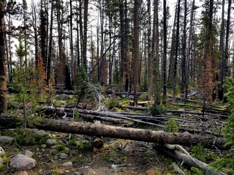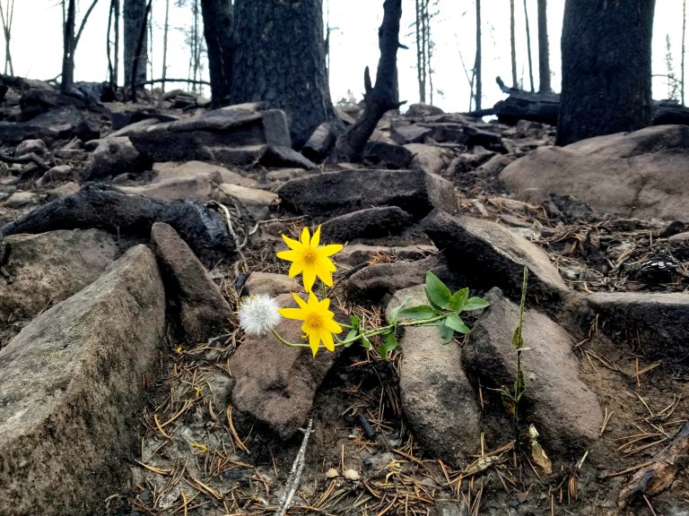 It was definitely a little bit rough in spots, but not as bad as others had projected. It really was fine to me, just a bit slow. It took me 2.5 hours to make about 3 miles. I would often loose the trail, but, I rather enjoyed picking my way around and looking for it, like I was on a scavenger hunt. It was fun crawling over blowdowns and getting soot all over my legs, and I did get a big gash somehow but don’t recall when or how. As I meandered through fresh burn scar, I found myself admiring the re-growth of the forest, especially all the little wildflowers that pop up in the ash.