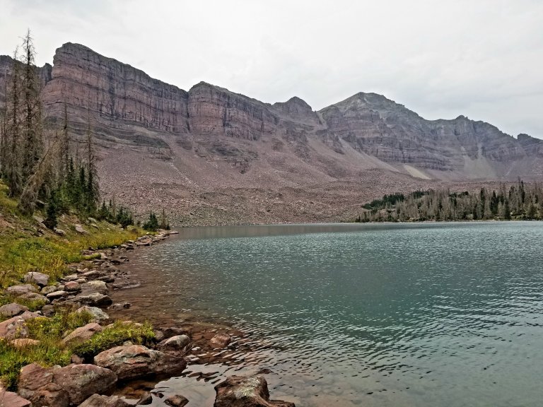 The walking was now much more pleasant through the trees with a clear trail to follow. I reached the top of Dead Horse Pass at 11,545 ft and the winds had really picked up, so I took in the expansive views of Dead Horse Lake which is at the bottom of a basin enclosed by the South arm/ridge of Mount Beulah.