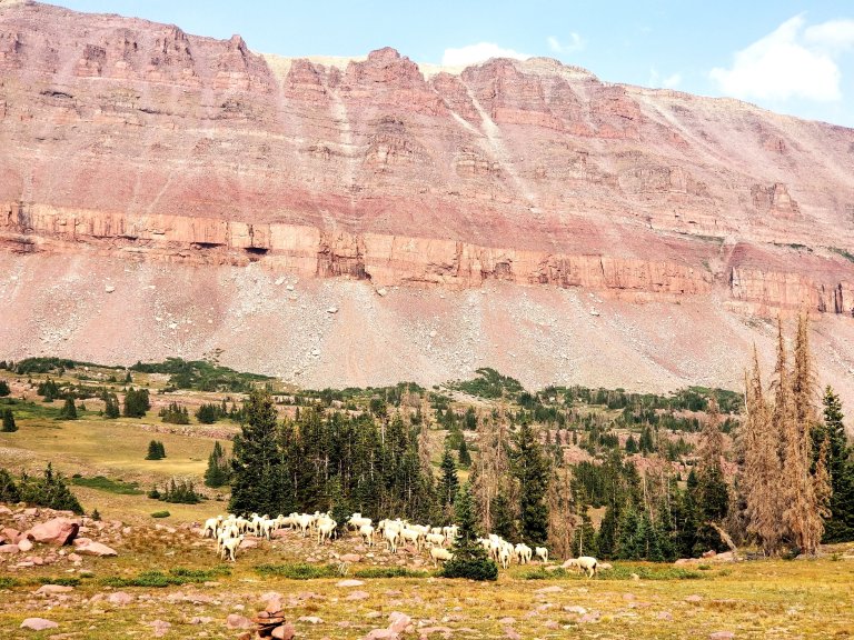 Down in the valley the trail is faint, I followed cairns throughout and eventually stumbled upon a flock of sheep. They were clustered right in my path and when they saw me, they’d run away, staying in a loose amorphous shape of the herd. I saw a white sheep dog and he came close to me but is not interested in me at all. I saw a blue tent in the distance, pitched smack in the middle of the giant valley. It is such an exposed place to camp, but I gather they know what they are doing.