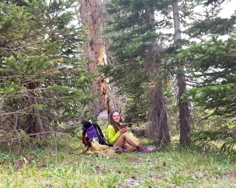 This is exactly what happened today. Just as I left treeline, the wind moved in, the temperature dropped and wow, the clouds were thick and hovering dark atop Red Knob Pass. It didn’t look like a good time to go up there, so I found a spot in a nest of trees to hunker down and wait it out, fixing myself an early lunch and a hot cup of earl gray tea, which really hit the spot!