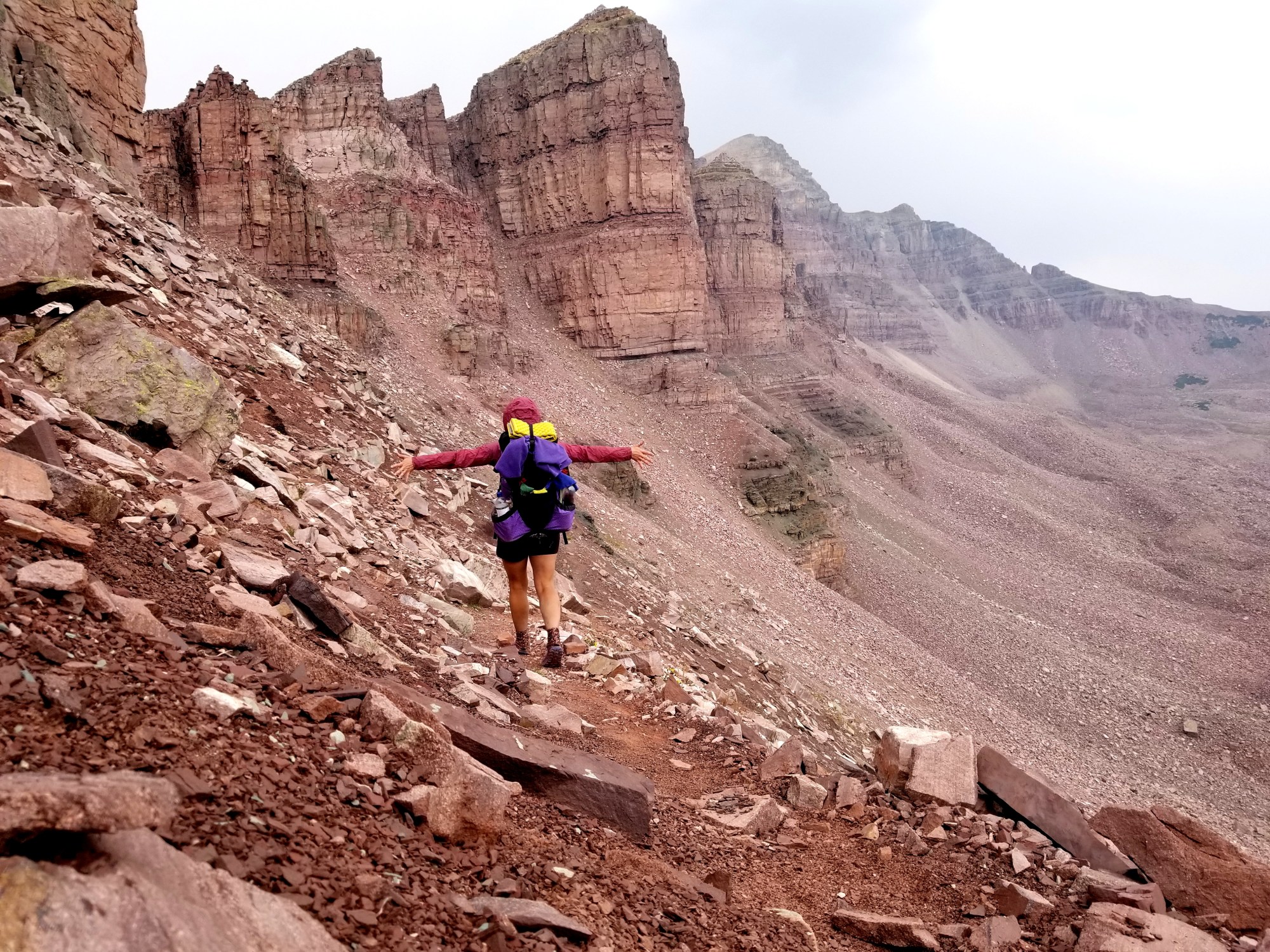 The range of these cliffs to the North are imposing and beautiful in an austere way. From Dead Horse Pass, the trail does a big switchback, before you begin to drop down quite steeply, hugging the walls of that basin. I dropped down and out of the whipping wind joyfully, taking in the sweeping vast views and energy of the enormous craggy cliffs.