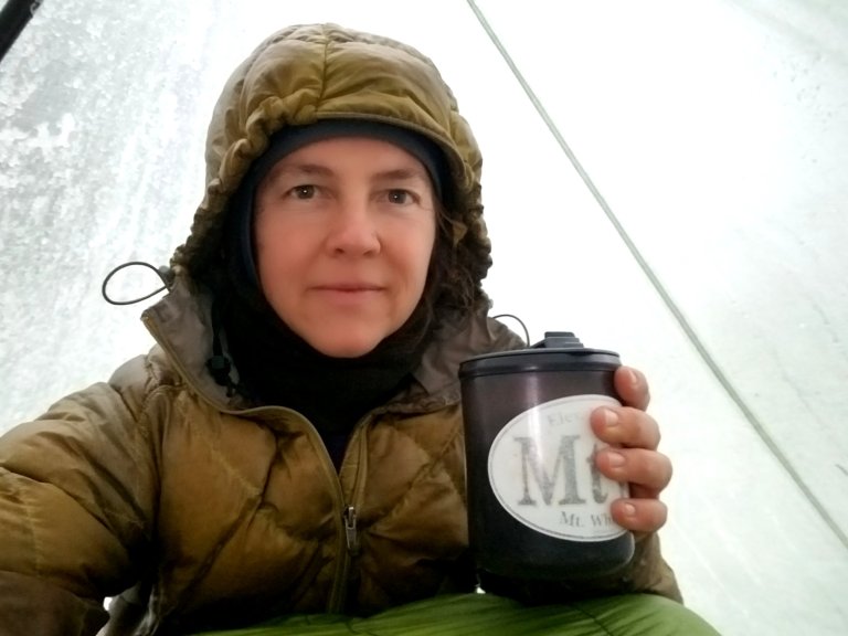 Morning: I must have fallen back asleep when the air temp plumetted just before dawn. I’d snuggled my face deeper into my sleeping bag and when I woke, it was light out, and that surprised me, Ididn’t think I’d fallen back asleep. It was not a good night’s rest. It rained heavily literally nonstop all night and at daybreak it turned to slush. It is still slushing now.