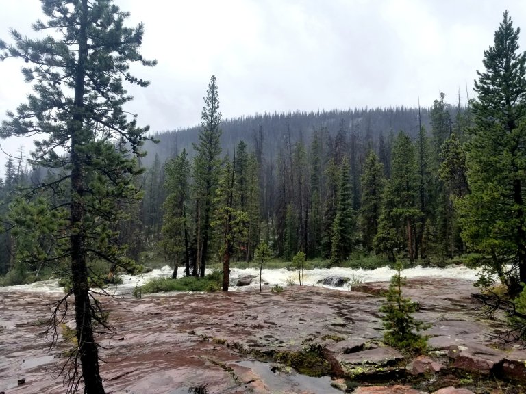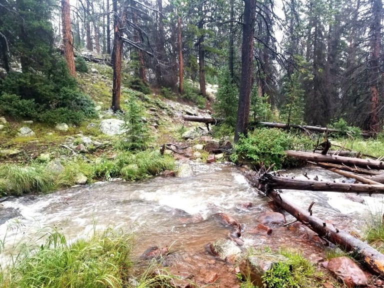 I text my Mom with my InReach and let her know I am moving and heading toward Moon Lake. I start to walk and realize immediately how much water truly fell last night. The trail is literally a stream, the little rivulet where I got water last night is a mid shin deep ford now, overflowing onto the trail. I have no choice but to plunge my feet into the icy water. This is going to be a long, wet, cold walk today. I just hope something good comes out of this decision.