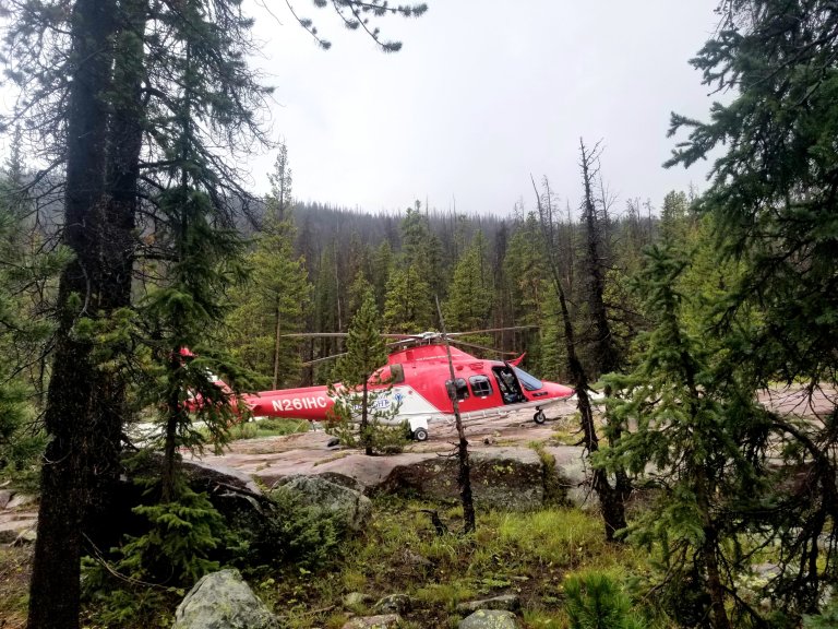 Ten or so minutes go by and the movement has stabilized my body temperature and I am no longer shaking thankfully. My new companion then apears in his wet clothes and rain poncho to let me know they can’t get the horses up here but they are going to send a Life Flight helicopter. He was able to inform them that there was a second hiker now, but has not gotten a response about that. I thank him and figure if they can’t take me, they at least know I am up here, and maybe they can come back for me, so I get a sense of relief knowing that SAR knows I am out here and in need of help.