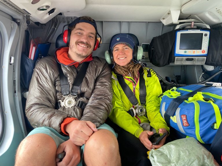 Soon, we are all buckled in, and lifting off. My friend and I are at first a bit shy about taking photos, but then the flight nurse offers to take one of us together! We both let our guard down a little, enough to take a few snapshots of the raging river and immense landscape below that is appreciated on a whole other level once in flight. Actually, it was really amazingly beautiful. Looking down at where we were, floating now so high above, I realize how small we are, and how truly remote of a location we were trapped in as well.