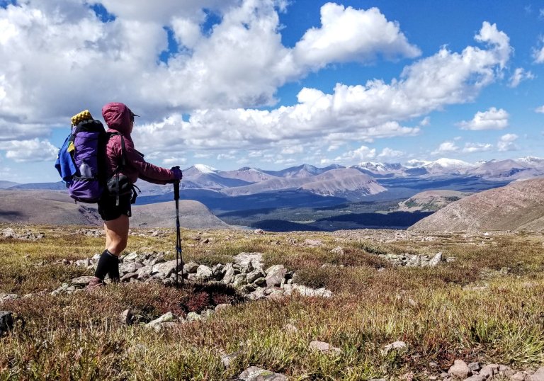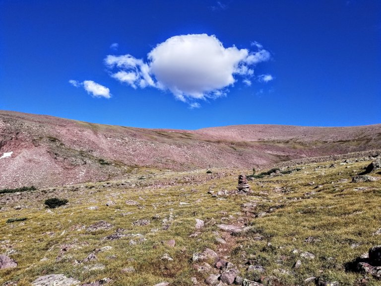We observe a large dark gray cloud building over a nearby ridge, and I then decide it is not a good time or place to make tea as I’d intended. Instead, we all pack up and hike on, away from the mean looking cloud.