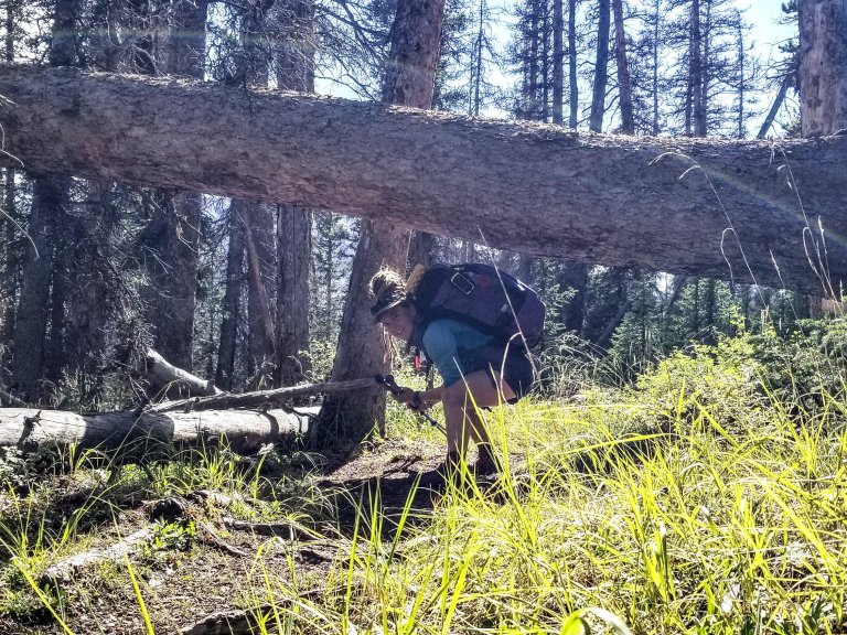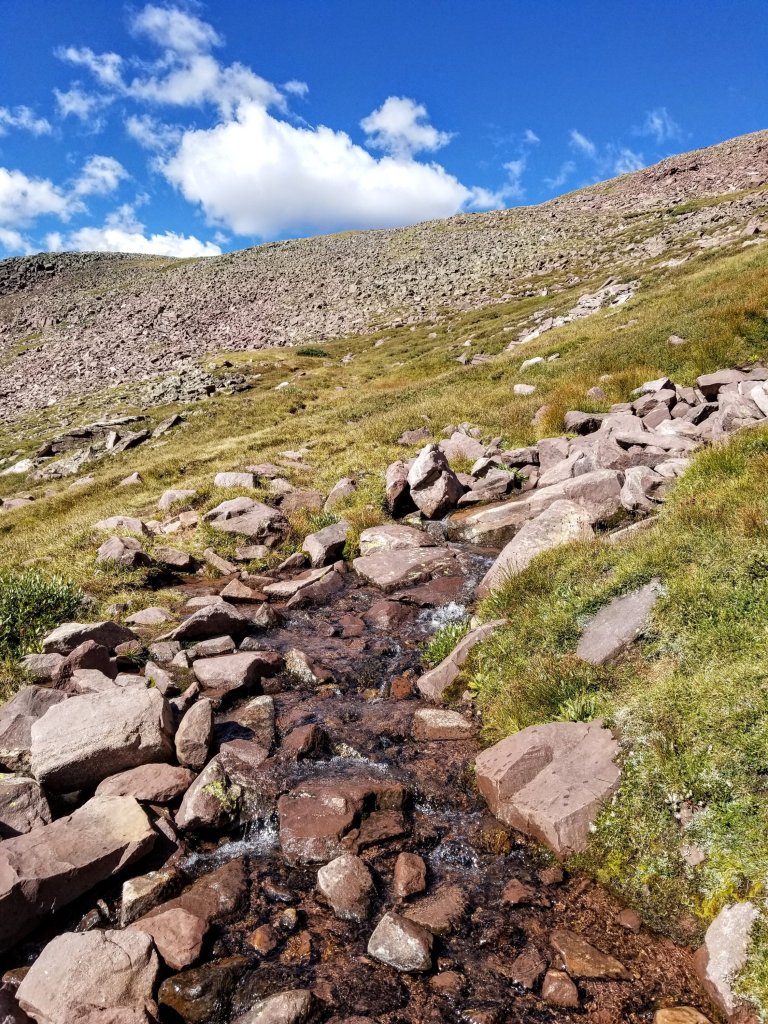 I keep on climbing and trudging through more bogs, more rocks on the trail, more water flowing over the rocks that make up the trail, and more mud that is the trail. There are several more creeks that flow across the trail and I must walk over two large logs and duck under another, but they are the fun kind of logs, obstacle course style!