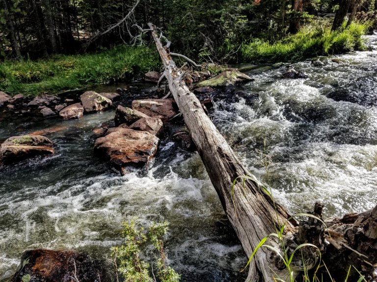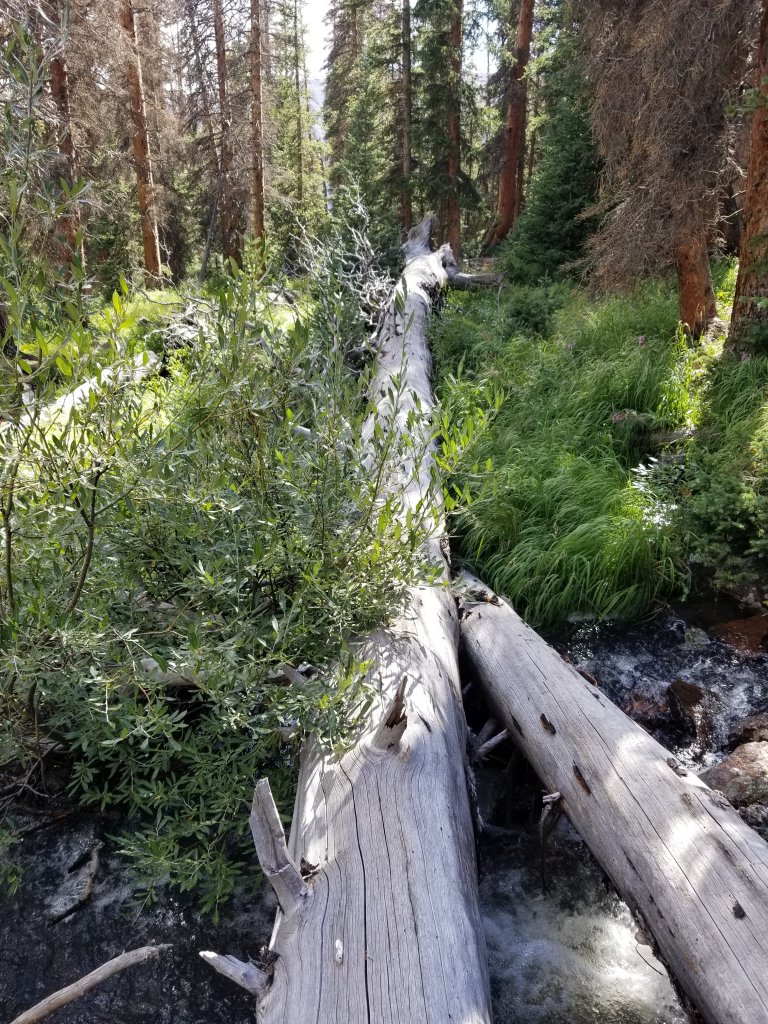 Around 6:00pm I check my mileage and want to still get in two more miles to reach closer to 18 miles for the day. Right then, as if the trail Gods are laughing at me, I reach a creek that is clearly going to be a difficult ford. I search around for a good 30 minutes trying to find a place to cross that I feel confident about. There are a couple of sketchy looking logs, one of them is too wet and slick looking to me. The other one too high above the water, and pretty narrow at that. Nope, and nope.