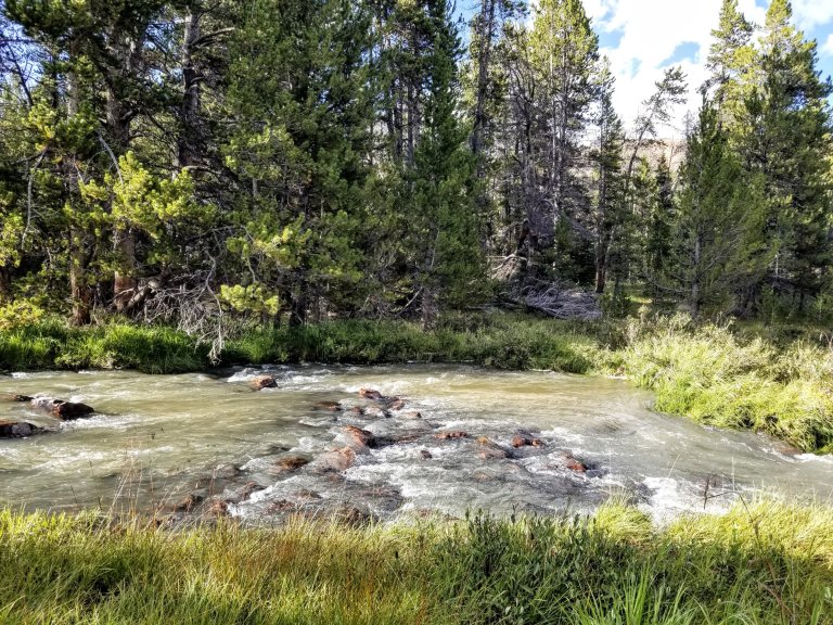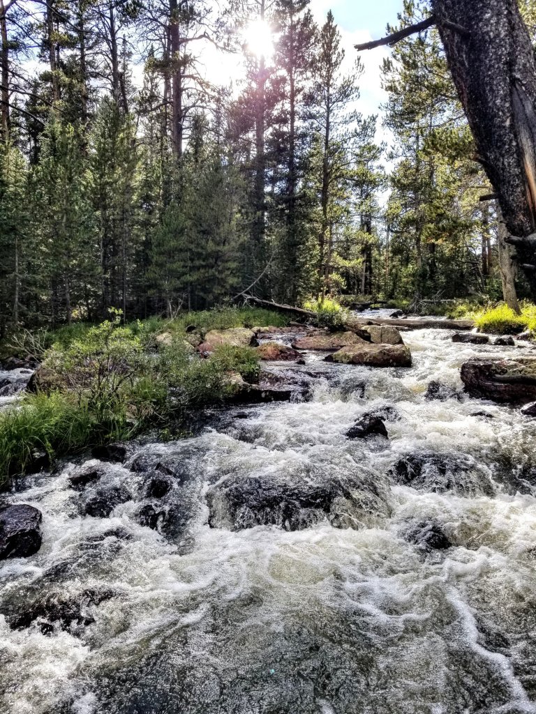 The water is swift but this is do-able. After sveral minutes of concentration, I am through it. Phew! I feel thankful that I was able to figure that one out, instinctively I knew there was a way. I felt that I chose a safe place to cross afterall and even if it did take a lot more time than a log crossing, I had my feet on the “ground” and made it across without taking that risk. Once my feet sre on the grass, I first feel a wave of relief, then think shit, I’m going to have to do that again on the way back!