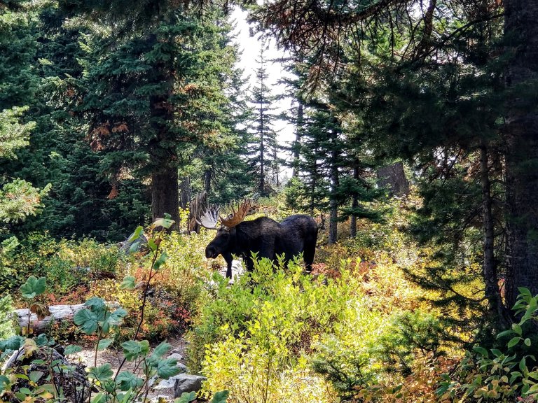 Shortly, I pop up to the crest of a small hill and run smack into two moose! I stand there like a statue for about three minutes, just watching them. There is a bull and a cow and they are nibbling on the foliage unaware of my presence. Eventually, the novelty wears off and I want to keep walking but they are so dang close to the trail. I am not sure what the proper moose etiquette is. Will they charge me if I walk too close? Will the male feel threatened? His rack is fricking enormous, and I don’t want that coming at me.