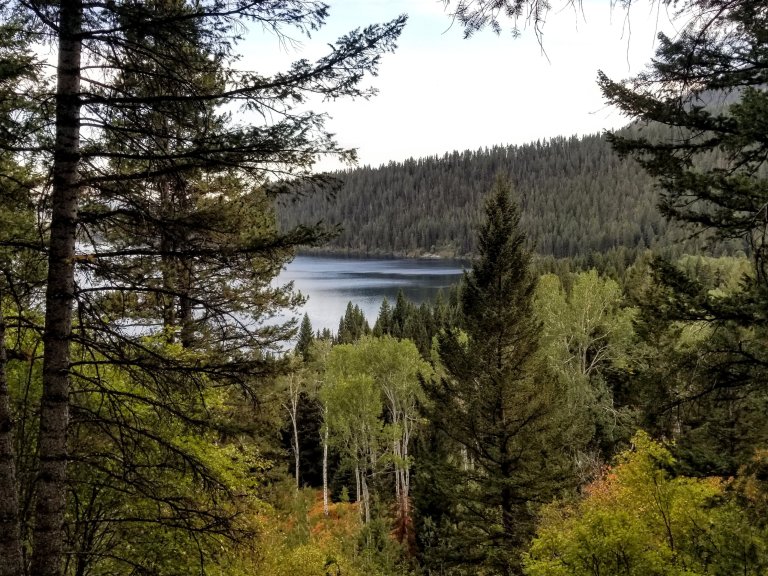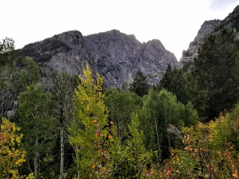 When I finally reach the top, I am at the Phelps Lake overlook at 7,200 ft and my GPS reads 20 miles. The views of the lake are quite beautiful, and the rock formations that continue up into Death Canyon are now towering above me in their imposing way, wearing a slate gray sheen like a mysterious cloak. The entire slope beneath me is thickly forested with remarkably tall, slender Aspens and sporadically placed wise old growth conifers dotting the shore.