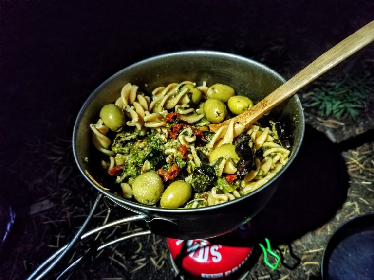 My dinner is a phenominal fusili chickpea pasta with veggies (onion, eggplant, zucchini, sundried tomatoes), pesto powder, coconut oil and manzana olives. I mean, it is really delicious, it’s like I am eating “real” food.