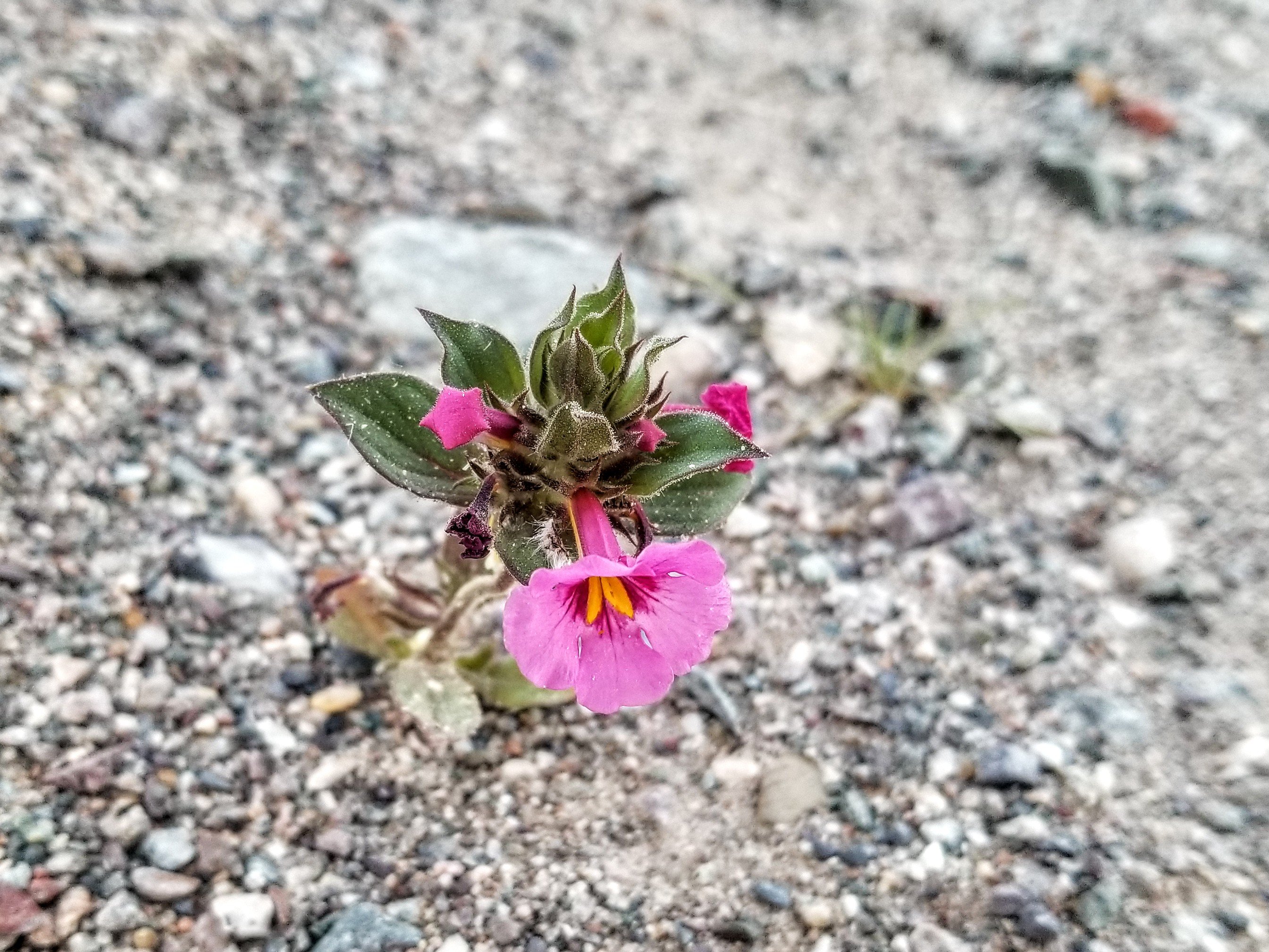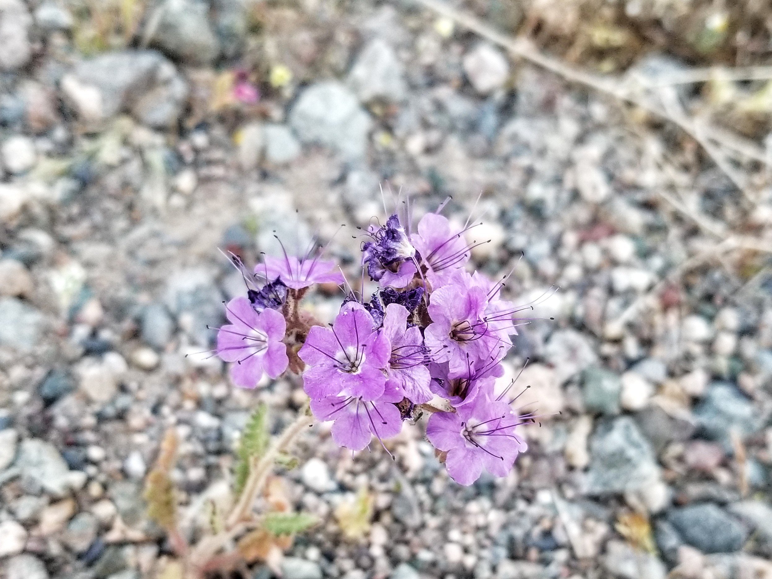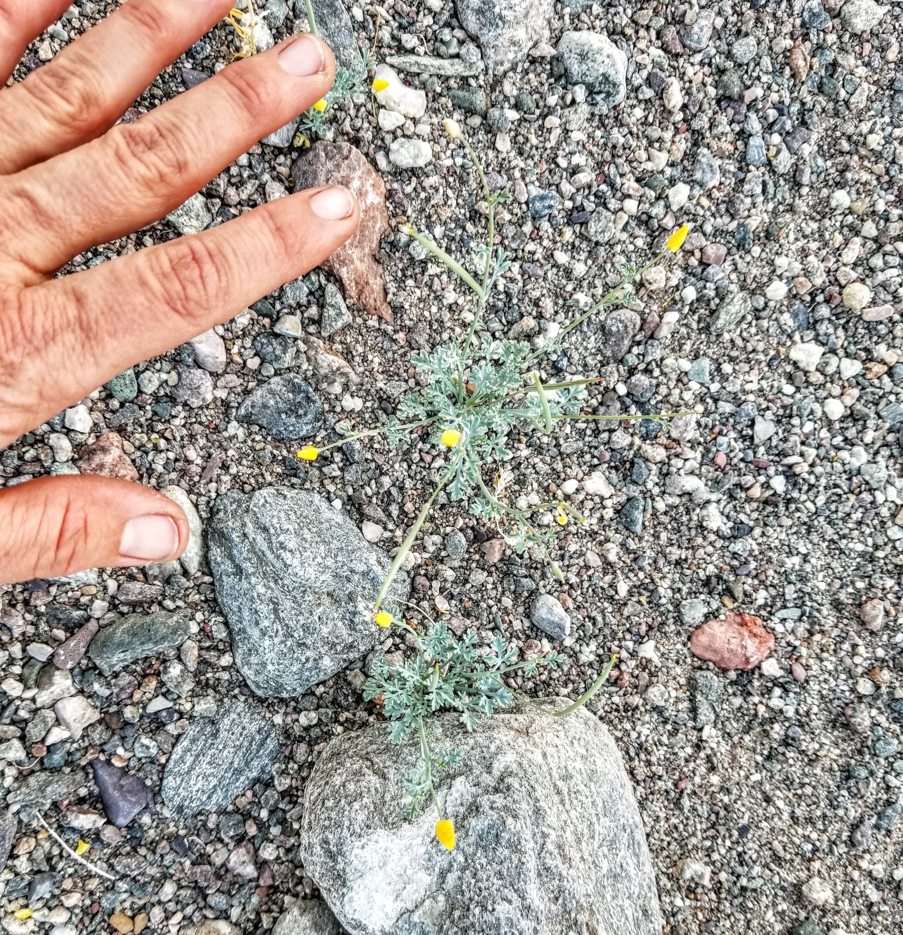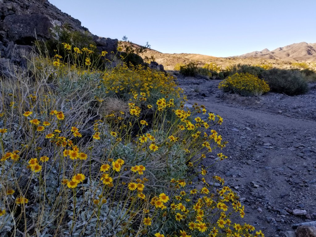 I rally to start walking again at 4:45pm. I rested an hour and fifteen minutes, but it’s still so damn hot. There in the shade it had dropped to about 93F but once back in that sun, oof! It’s radiance is just so intense, just scortching. I trudge onward, trying to hug the edge of the slopes that occasionally produce shade. There are so many beautiful wildflowers out here, espeically the yellow buckwheat flowers, they are lining the wash and there are tons of tiny flowers on the ground, I have to be careful not to crush them. I even spotted teeny little poppies about to unfurl, their flowers the size of my pinky nail, even smaller. I am aware of what a gift all these wildflowers are as I cruise along, but it is hard for me to really appreciate them when all I am thinking about is the heat and when the sun will dip below the horizon.