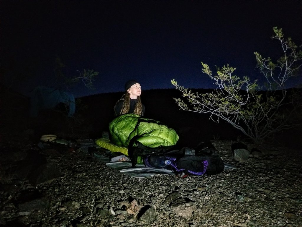 When I get to camp I strip down naked, letting the soft breeze brush over my body and I feel really free in the balmy temperatures in the dark in the middle of the desert as stars emerge like diamonds above me. I take a mini pack towel, drop it into a zip lock and add a few drops of my precious water. This is enough to wipe down my salty body and then sitting there bare naked drying out feels so amazing. I am actually refreshed from just that little wipe down and it did my morale wonders. I really wish I could chug en entire liter of water right now but I cannot. Have I mentioned that?
