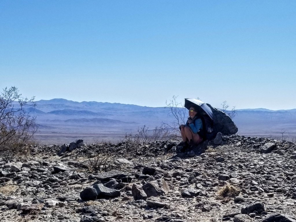 I make my way across the wash towards the sand dunes on the other side. I am starting to feel a little desperate after less than an hour, and finally, by 3pm, I spy a large stone next to which offers about 2 ft wide of shade. I drop my pack and scoot up next to the rock, tucking my body into a ball to fit inside the shade. Along with the help of my umbrella propped above me, I get a little relief, but within about 5 minuts its really no use, so I start walking again.