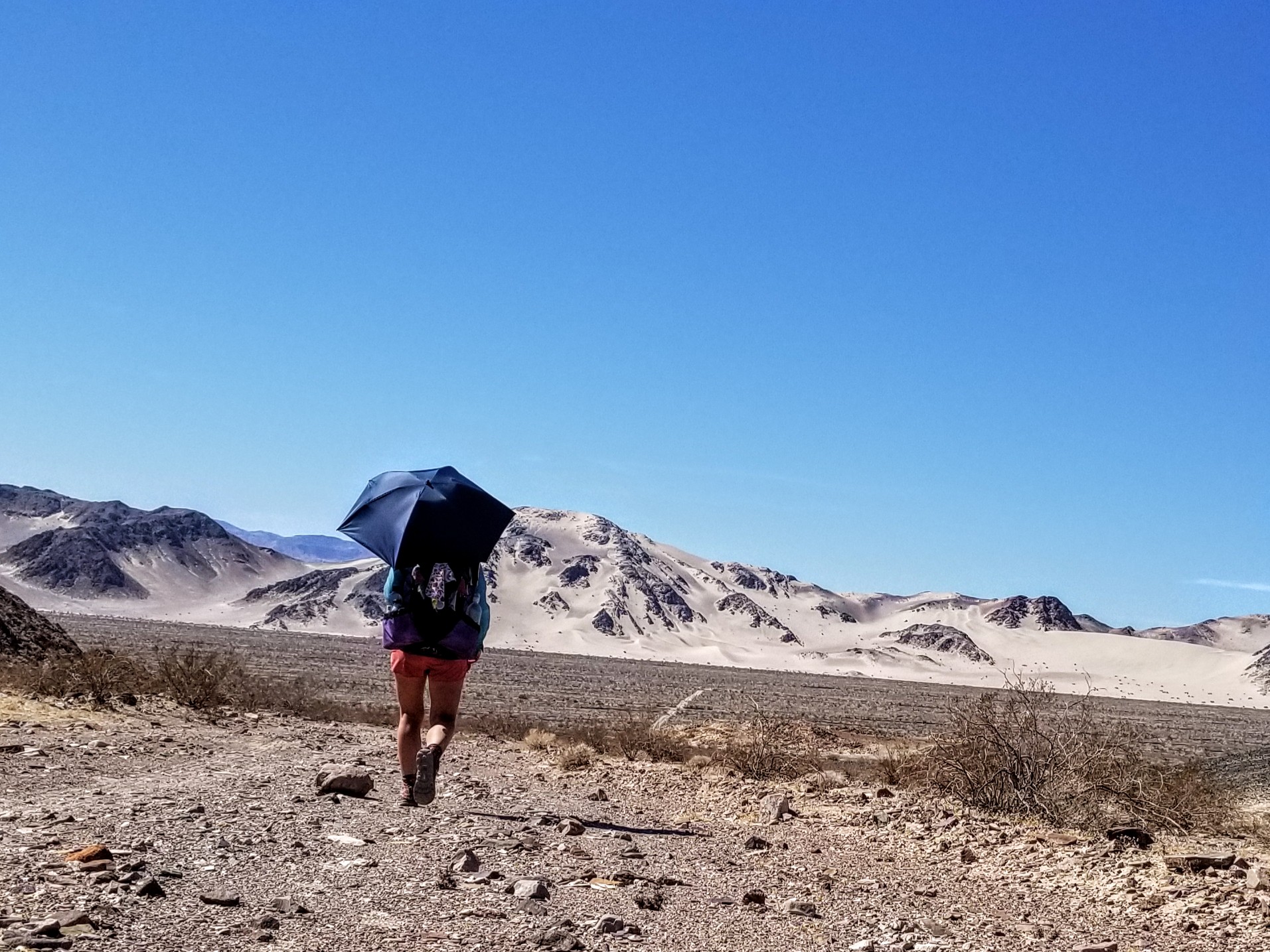 The correct dirt track shoots me through a short narrower canyon and then spits me out across the massive Buckwheat Wash. It is a lot larger than I expected and just as the heat is reaching it’s apex for the day I realize I am about to walk across this massive expanse with absolutely zero shade for the next few hours. I now have my new Montbell sun umbrella fully deployed and while it does take the edge off the heat, it is still so darn hot, claustrophobic almost. If only that Spring had had water I could have wet my clothing and my head. Alas, the Spring was not a Spring.
