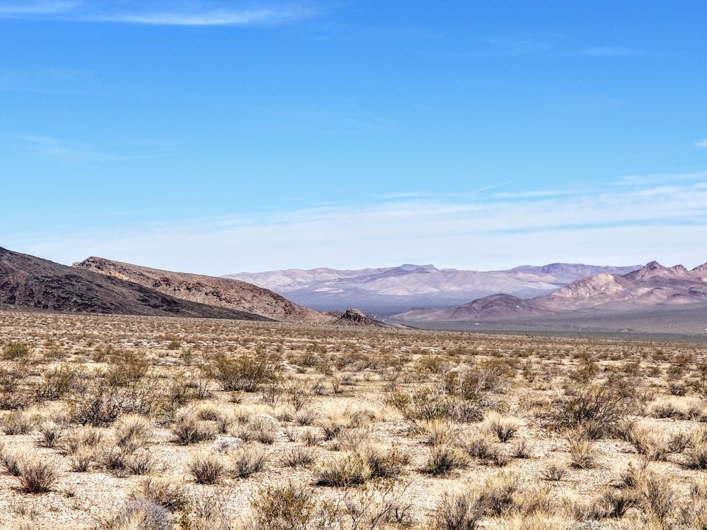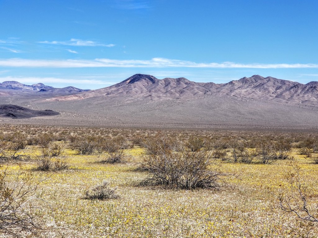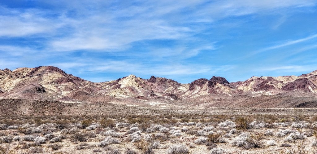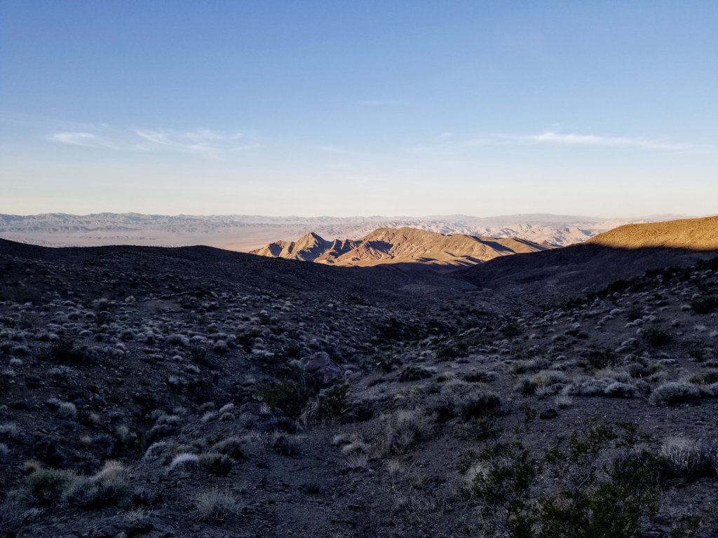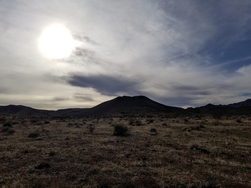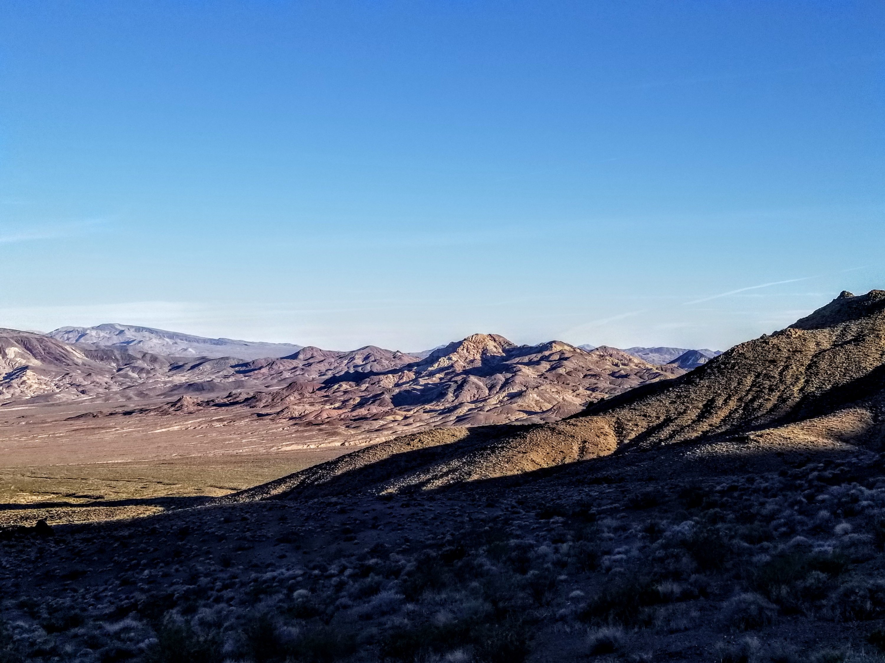 I’ve been sitting for over an hour, it’s 2:30pm and I’m ready to move. My next objective is ~8 miles to the unnamed pass, which will drop me into Gold Valley, then 1-2 miles to the water cache. From here there are very few landmarks and I break the next chunk of miles into two four mile sections. For now, I aim loosely at a prominence in one of the distant mountains. The walking is no longer smooth or flat, but instead on rocky tedius terrain that dips into little washes and climbs back up, following the curves of the mountain slope which fans out into the flat desert. I wonder if there is anywhere I could walk faster? I look further down hill, but nothing looks promising enough. Alas, I trudge along the tedius terrain. I stop to take in the scene, my surroundings are stunning.