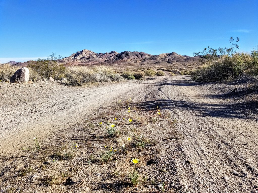 Eventually the canyon and wash hooks onto an old dirt track near the American Mine, which I do not take the optional detour to go see. I am singularly focused on getting to my water cache. The dirt track is probably 100+ years old and is quite overgrown and hard to follow in places. I see remnants of rock walls that once acted as embankments to prevent erosion, and wonder just how long ago it was that humans were here stacking such rocks and driving their old rickety vehicles out here to look for gold. It’s kind of wild. It’s like the wild wild west.