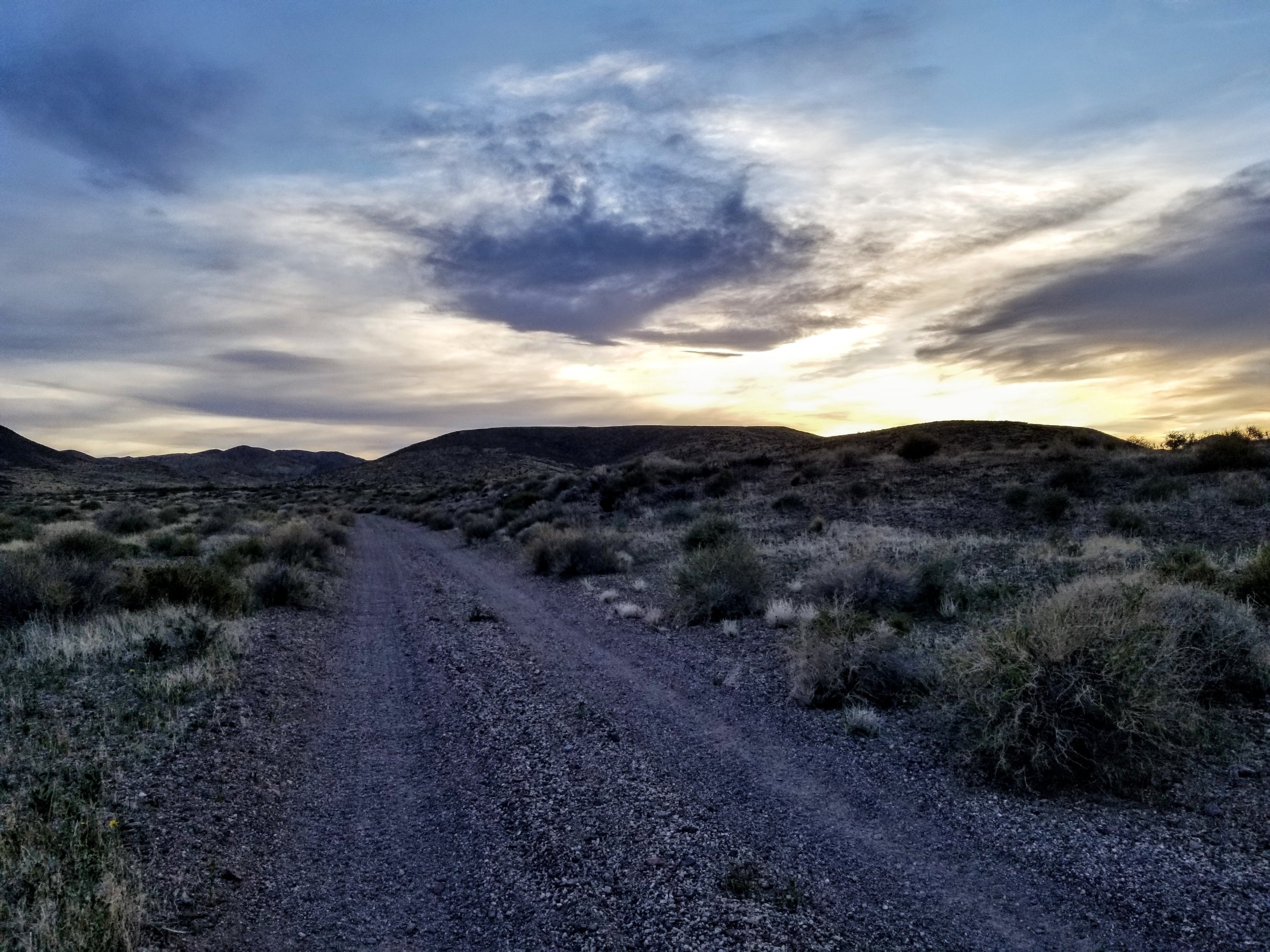 From the ridge/pass I practically float down the easy slope to flat land again. I am walking through sage brush clusters and the sun is sinking closer to the horizon. Relief is beginning to wash over me as I realize I have made it through the day. The road is tucked into the folds of the Earth and I can’t see it until I am literally on it. It’s amazing how these little moments of victory bring so much relief and cause for celebration. Happy dance, whoo hoo! Now it’s only .6 miles to my water. I am feeling more and more optimistic. The energy in this valley is quite peaceful and this is my favorite time of day. I begin to contemplate whether I want to night hike since it’s going to be dirt track walking for a chunk of miles now.