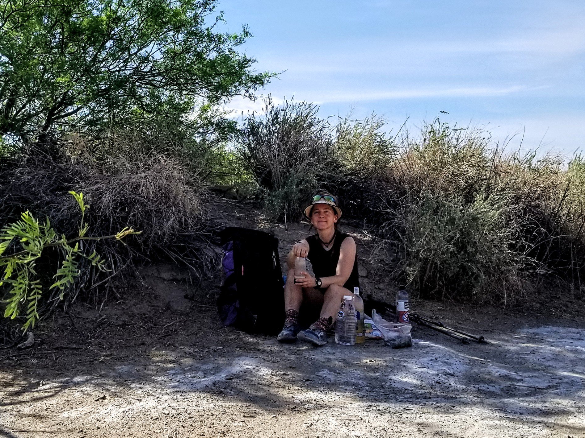 The road is lovely but quite repetative and as I’m keeping a 3.2mph pace my ankle starts to feel incredibly sore, just like last night. I ease up my pace a bit. Even still, I make good time. Along the lonesome road, I see five people on dirt bikes heading in the opposite direction and they wave at me. The first humans I have encountered on this journey. When I make it to Shorty’s Well it’s 9:30am and I beeline straight to my water cache. That’s 4 for 4, they have all remained intact! I plunk down in the shade of a wispy Tamarisk tree. I’m thankful for a reprieve from the sun and wind and more coffee is definitely in order.